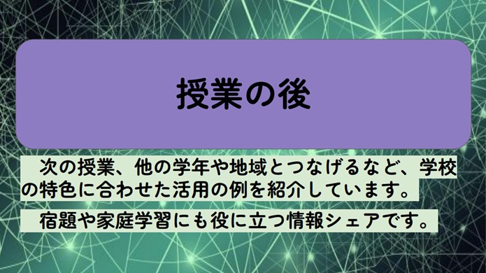 次の授業、他の学年や地域とつなげるなど、学校の特色に合わせた活用の例を紹介しています。 宿題や家庭学習にも役に立つ情報シェアです。